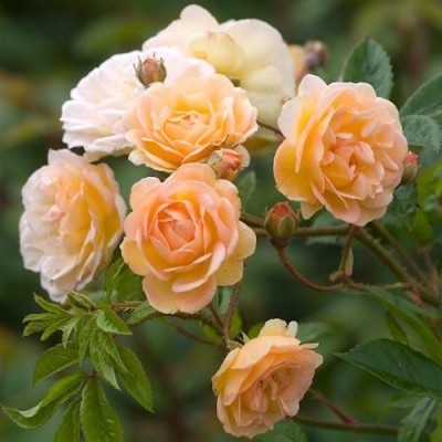 Роза Гислен де Фелигонд, известная своим уникальным желто-оранжевым оттенком бутонов, при распускании превращается в нежные абрикосовые лепестки с золотистыми тычинками, создавая поистине очаровательное зрелище.